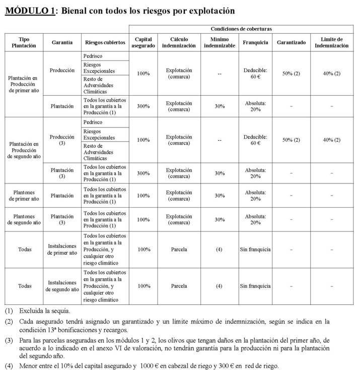 – Para los módulos 1 y 2 se podrá contratar un seguro complementario en primavera de forma independiente para cada una de las dos cosechas, con coberturas frente a pedrisco y riesgos excepcionales.