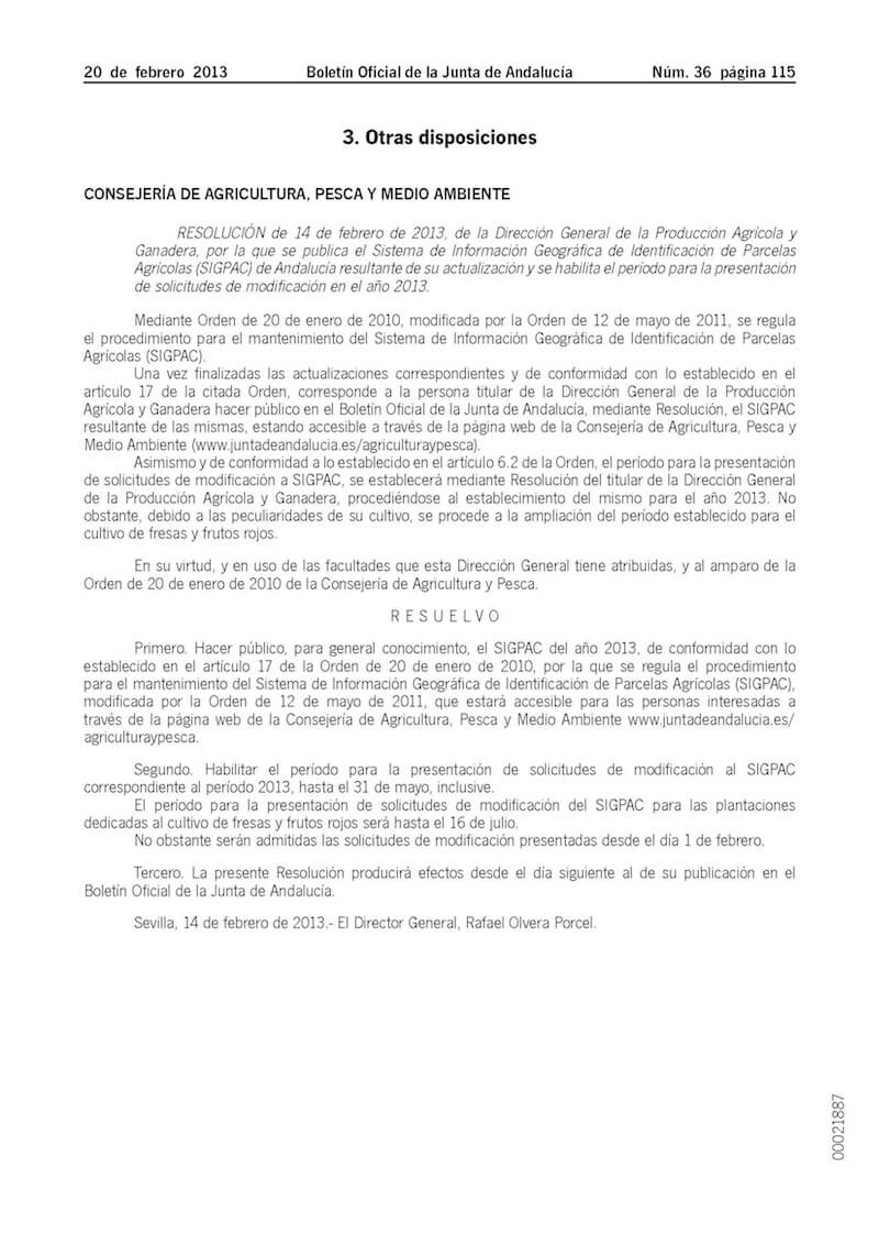 La Junta de Andalucía abre el plazo para realizar modificaciones de lindes en el Sigpac, que no es otra cosa que el Sistema de Información Geográfica de Identificación de Parcelas Agrícolas de Andalucía, del que os hablaba el otro día, os decía que se había actualizado para este 2013.