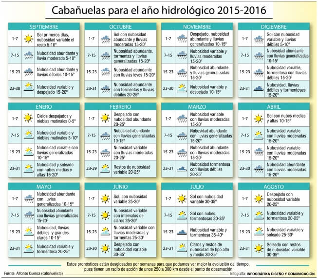 Poniéndonos en antecedentes; El origen de las cabañuelas se remonta a hace unos 35.000 años antes de Cristo, cuando la luna era la única referencia del tiempo que el hombre tenía para cazar y pescar. Posteriormente, los egipcios se fijaban en los niveles del Nilo y la estrella Sirio, que es la base para que las cabañuelas se hagan a partir del 1 de agosto. Las cabañuelas se hacen en el mes de agosto con los 24 primeros días. “Primero se cogen los 12 días primeros de agosto, que son las cabañuelas, que van hacia abajo, (1-agosto, 2-septiembre, 3-octubre,…), y luego se cogen del 13 al 24 de este mismo mes, que son las que van hacia arriba (retornas), je,je,je, parece complicaillo… pues para Alfonso no lo es ;).