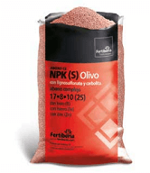 La empresa Fertiberia ha lanzado un nuevo tipo de abono complejo para el olivar, el NPK (S) Olivo con lignosulfonato y carbolita 17-8-10 (25) con boro, hierro y zinc.