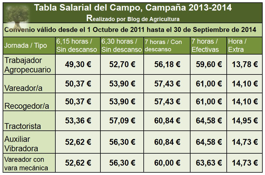 En lo referente a los empleos relativos a la aceituna, el salario medio de un vareador y un recogedor de la categoría de jornada más frecuente (6:15 horas sin descanso) será de 50,37 euros. Todos los precios que veréis en la tabla salarial 2013-2014, como los que podáis ver en otras web’s, incluidas sindicatos, patronales, etc.. pueden variar un céntimo arriba o abajo, dependerá de la aplicación usada o el redondeo, lo que vengo a decir es que no seáis muy miserables, jajaja, ¡que más dará un céntimo arriba o abajo!
