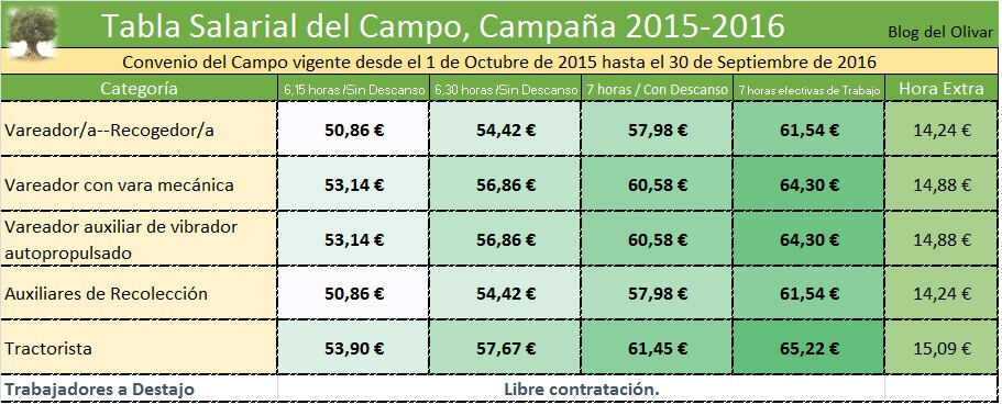 Si queréis ampliar información o descargaros el BOP del convenio, donde tendréis toda la información detallada, podéis ir a la noticia que pusimos el año pasado en el Blog del Olivar sobre la Tabla Salarial del campo en Jaén 2014-2015.