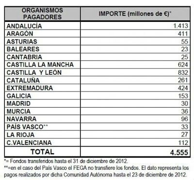 El Ministerio de Agricultura, Alimentación y Medio Ambiente ha transferido a las CCAA, 4.555 millones de euros para el pago de las ayudas directas de la PAC de la campaña 2012. Las transferencias han permitido a las Comunidades Autónomas abonar a los agricultores los pagos, en el período comprendido entre el 16 de octubre y el 31 de diciembre de 2012. En los próximos meses, y hasta el 30 de junio de 2013, las CCAA seguirán realizando los pagos para completar el abono total de las ayudas directas de la PAC de la campaña 2012.